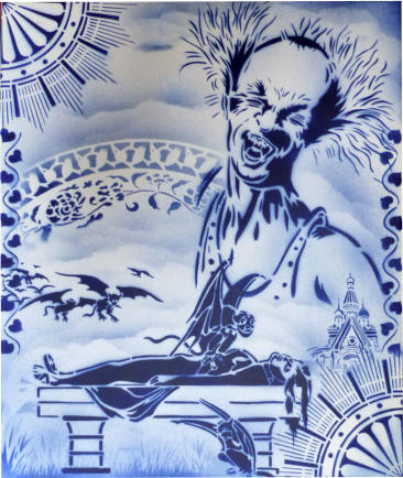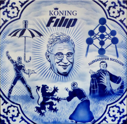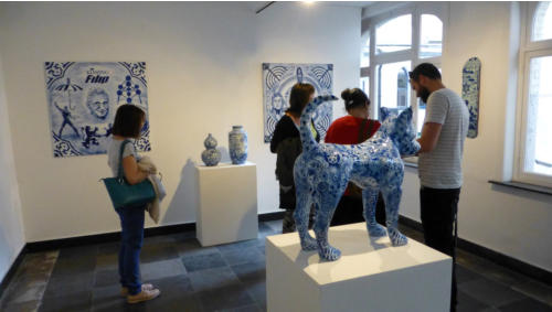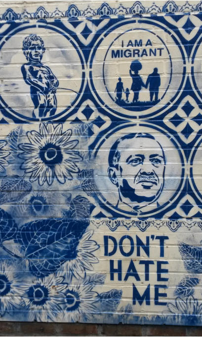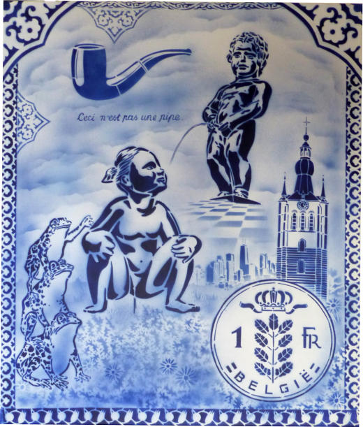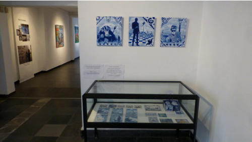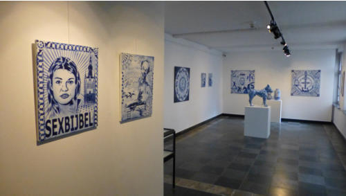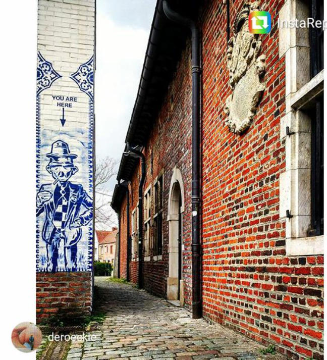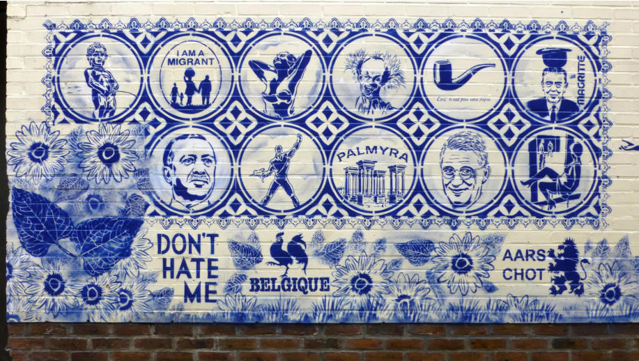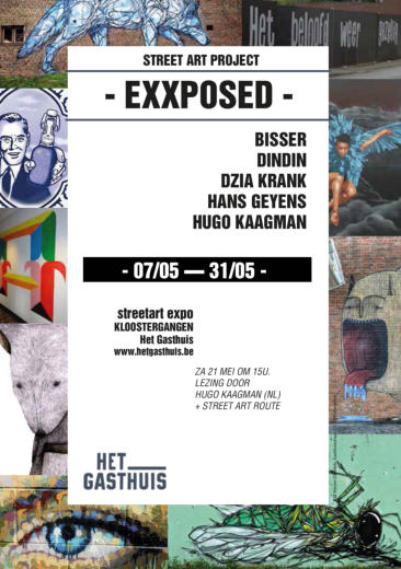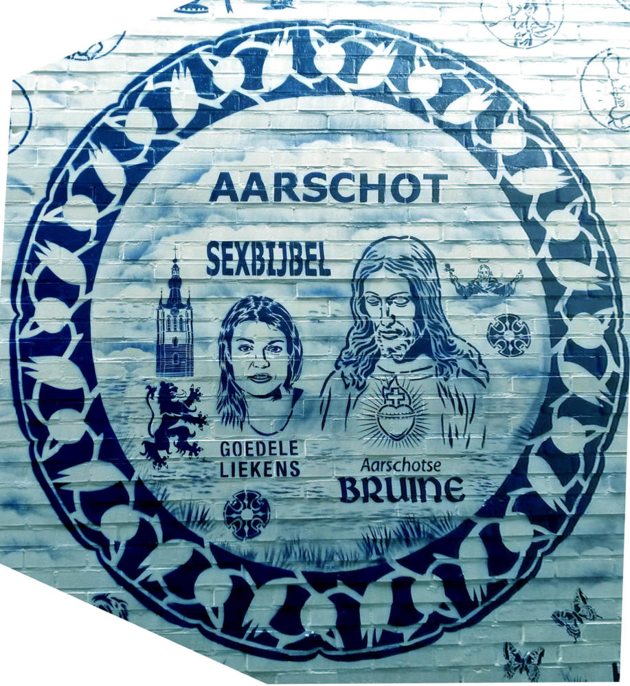 Story telling, Delfts blauw en exotisme van Hugo KaagmanIn 2016 organiseerde CC gasthuis naar aanleiding van het 25-jarig bestaan, het evenement Exxpose, waarbij verschillende plaatsen in de stad verfraaid werden met het werk van streetartkunstenaars. Op een schijnbaar beetje verloren hoek van de gasthuissite zie je het werk van Hugo Kaagman. Het blauw van de tekeningen is opvallend en de goede waarnemer ziet dat deze kleur perfect aansluit met randversieringen die doen denken aan Oosterse motieven. Dat aspect van vertrouwd Delfts blauw en exotisme, technisch uitgevoerd met stencils, is het handelskenmerk van deze beeldende kunstenaar.De plaats is goed gekozen: de witte achtergrond van de bibliotheekmuur maakt dat het Delfts blauw bijna geïntegreerd in het gebouw wordt opgenomen; het smalle verborgen steegje doet een beetje denken aan nachtelijke illegaliteit. En toch wordt deze binnenweg door de buurbewoners vaak genomen. Het werk blijft zeker niet onopgemerkt.Je moet wel de tijd nemen om het drukke verhaal te lezen. Je vindt er zowel elementen in terug die naar Aarschot, België en zelfs de hele wereld verwijzen als provocerende uitspraken die ‘breed’ maatschappelijk getint zijn’. Je ziet allusies op internationaal gerenommeerde werken, kunstenaars en politieke personages. Die faam wordt gerelativeerd door verwijzingen naar stripfiguren en kinderhelden. De teksten zijn eigenlijk ‘recht voor de raap’, provocerend omdat ze de schijn van seksisme en racisme wekken. Het is moeilijk om hier een allesomvattend thema terug te vinden tenzij je het als een kroniek van een tijdsperiode wil zien zoals de gewone man die vandaag beleeft. Auteur: Jan Rymenams