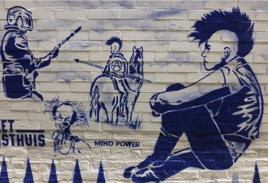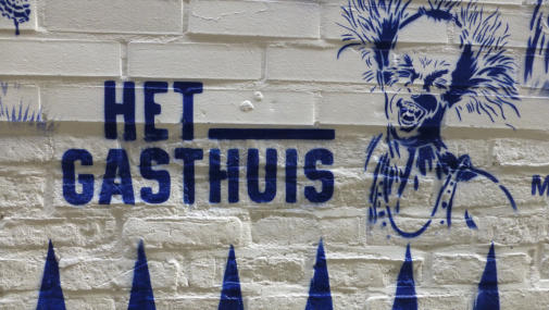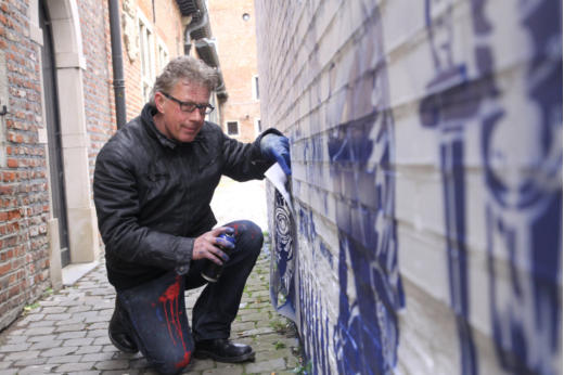 Story telling, Delfts blauw en exotisme van Hugo KaagmanIn 2016 organiseerde CC gasthuis naar aanleiding van het 25-jarig bestaan, het evenement Exxpose, waarbij verschillende plaatsen in de stad verfraaid werden met het werk van streetartkunstenaars. Op een schijnbaar beetje verloren hoek van de gasthuissite zie je het werk van Hugo Kaagman. Het blauw van de tekeningen is opvallend en de goede waarnemer ziet dat deze kleur perfect aansluit met randversieringen die doen denken aan Oosterse motieven. Dat aspect van vertrouwd Delfts blauw en exotisme, technisch uitgevoerd met stencils, is het handelskenmerk van deze beeldende kunstenaar.De plaats is goed gekozen: de witte achtergrond van de bibliotheekmuur maakt dat het Delfts blauw bijna geïntegreerd in het gebouw wordt opgenomen; het smalle verborgen steegje doet een beetje denken aan nachtelijke illegaliteit. En toch wordt deze binnenweg door de buurbewoners vaak genomen. Het werk blijft zeker niet onopgemerkt.Je moet wel de tijd nemen om het drukke verhaal te lezen. Je vindt er zowel elementen in terug die naar Aarschot, België en zelfs de hele wereld verwijzen als provocerende uitspraken die ‘breed’ maatschappelijk getint zijn’. Je ziet allusies op internationaal gerenommeerde werken, kunstenaars en politieke personages. Die faam wordt gerelativeerd door verwijzingen naar stripfiguren en kinderhelden. De teksten zijn eigenlijk ‘recht voor de raap’, provocerend omdat ze de schijn van seksisme en racisme wekken. Het is moeilijk om hier een allesomvattend thema terug te vinden tenzij je het als een kroniek van een tijdsperiode wil zien zoals de gewone man die vandaag beleeft. Auteur: Jan Rymenams